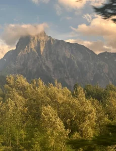 Upon leaving Seattle, the views of Puget Sound and then the Cascade Range east of Seattle were magnificent. I found myself viewing large expanses of sparkling, sun-lit water and then suddenly, in the woods, with the train right up against rising boulders ascending into deep, deep forests. Then, after emerging from this dark, beautiful landscape, there were high peaks both close and in the distance. These, I thought, were some of the views I had hoped to behold.