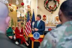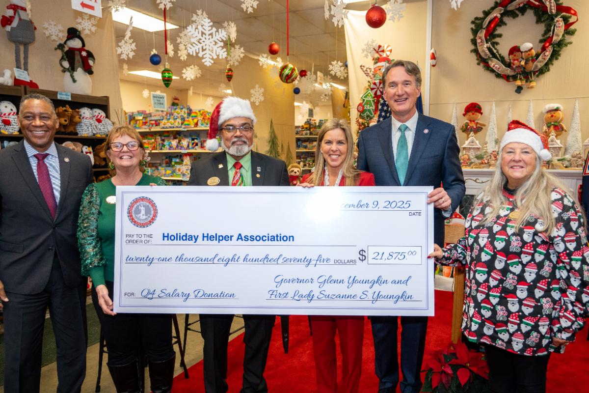 Governor Glenn Youngkin and First Lady Suzanne S. Youngkin visited Fort Lee’s Holiday Helper Toy Store today to present $21,875 to the Holiday Helper Association, a nonprofit dedicated to ensuring military children experience the joy of the holiday season. This quarterly salary donation reflects the Governor and First Lady’s commitment to supporting military families and organizations who uplift families across the Commonwealth.