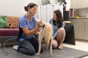 The rehabilitation service’s shockwave device, donated by a supporter passionate about senior animal care, uses high-energy, targeted sound waves to penetrate deep into injured tissue. There are several rehabilitation modes that can be used to manage osteoarthritis. Extracorporeal shockwave therapy is unique in that it can reach deeper tissue and target arthritic joints, and it is one of the best treatment options for damaged tendons or ligaments.