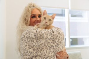 (From left) Cynthia Sutton and her cat Piggy, a recent patient of the Animal Cancer Care and Research Center. Photo by Madison Brown for Virginia Tech.
