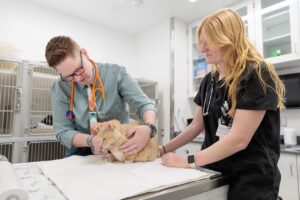 (From left) Jonel Nightingale and Natalie Holstege performing a physical exam on Piggy the cat, a recent patient at the Animal Cancer Care and Research Center. Piggy has been undergoing a combination of half-body radiation and chemotherapy treatments. Photo by Madison Brown for Virginia Tech.