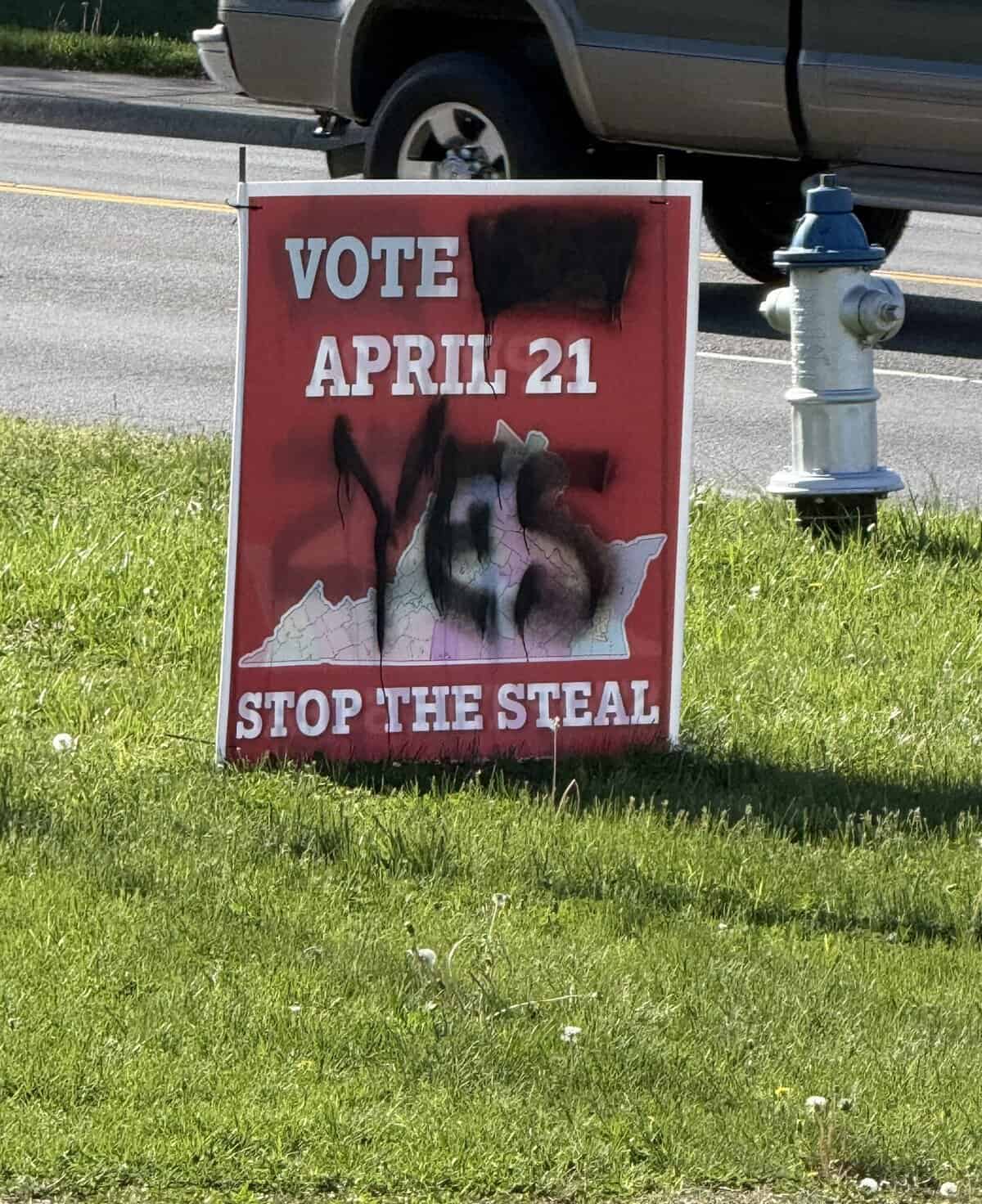 Unfortunately, vandalism is not the only way some on the “vote yes” side are fighting unfairly. In one neighborhood in East Roanoke County, at least three small “vote NO” signs have been stolen from people’s yards. One of those property owners, who wishes to remain unnamed, had this to say, by text: